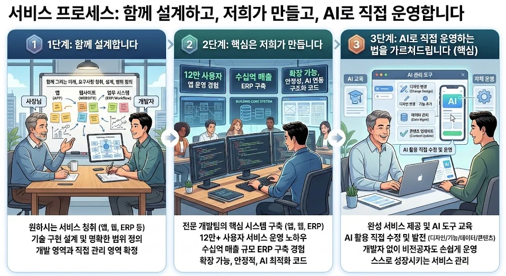 앱이든, 웹이든, ERP든 – 핵심 시스템은 저희 전문 개발팀이 구축합니다. 12만 명 이상이 사용하는 서비스를 운영해본 경험, 매출 수십억 원 규모의 기업 ERP를 구축해본 경험이 녹아 있습니다. 대충 만들지 않습니다. 확장 가능하고, 안정적이며, 이후에 AI로 수정할 수 있도록 구조화된 코드를 짭니다.