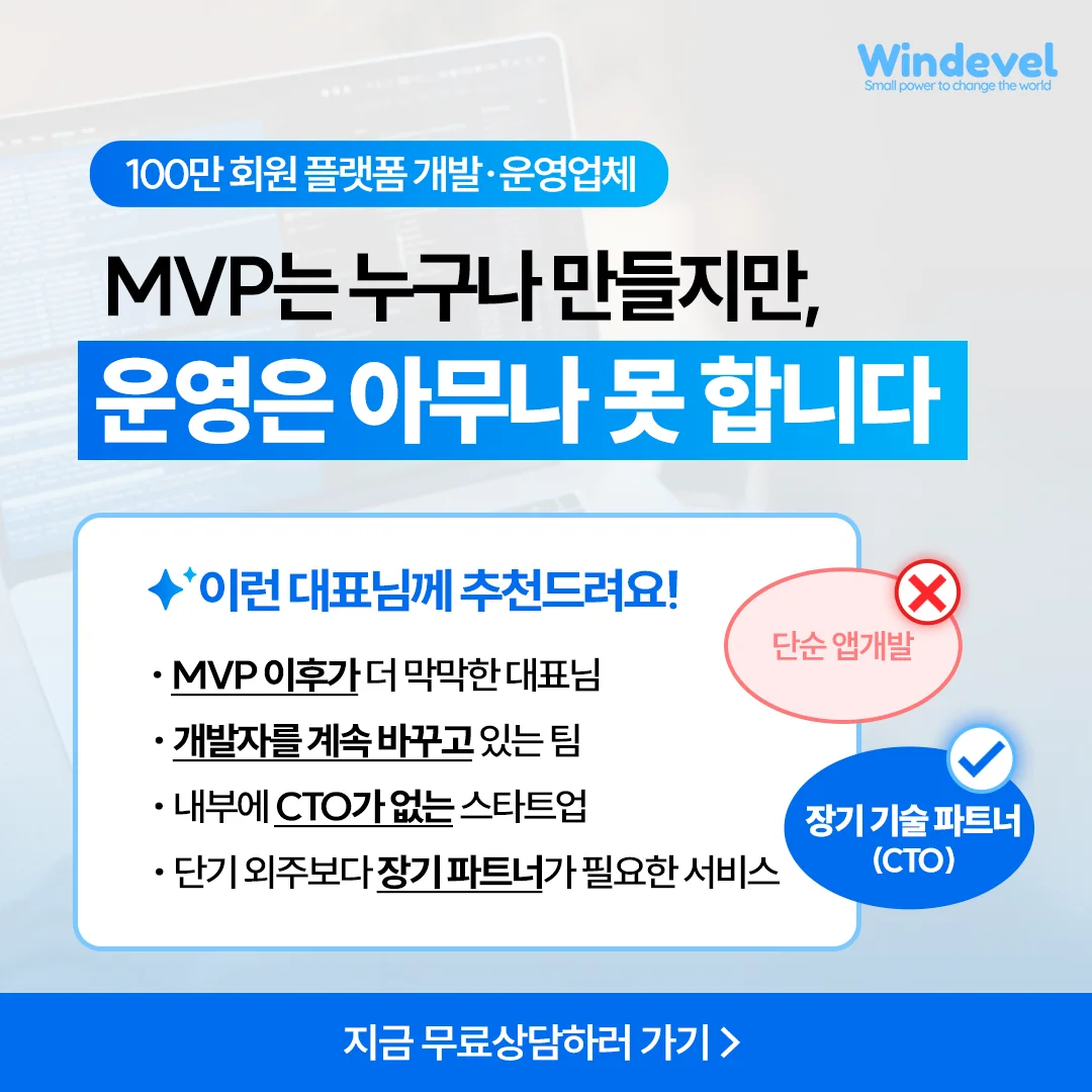 저는 윈디벨(Windevel)을 운영하고 있는 개발자입니다. 10년 넘게 현장에서 코드를 짜고, ERP 시스템을 구축하고, 12만 명이 넘는 사용자가 쓰는 서비스를 운영해왔습니다. Java, Python, React, Flutter, AI 솔루션까지 – 기술 스택을 나열하자면 길지만, 제가 오늘 하고 싶은 이야기는 기술 자랑이 아닙니다.